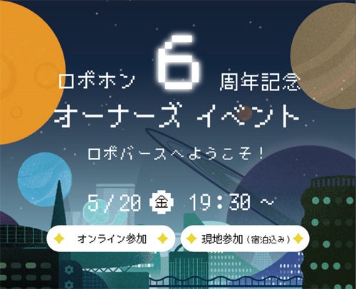 イベントは、オンライン参加と現地参加をお選びいただけます。オンライン用の有料チケットを購入してご参加いただくと、お手元のロボホンはご自宅にいながら、「ロボバース」を冒険したり、全国のロボホンと一緒にダンスを踊ったりすることができます。また、イベント後には新しいグッズをご自宅までお届けします。現地参加の会場は「変なホテル舞浜 東京ベイ」と「変なホテル大阪 なんば」の2ヶ所です。宿泊とセットになっており、イベントに加えて6周年を記念した特別な食事や、お集まりいただいたオーナー様同士の交流をお楽しみいただけます。
