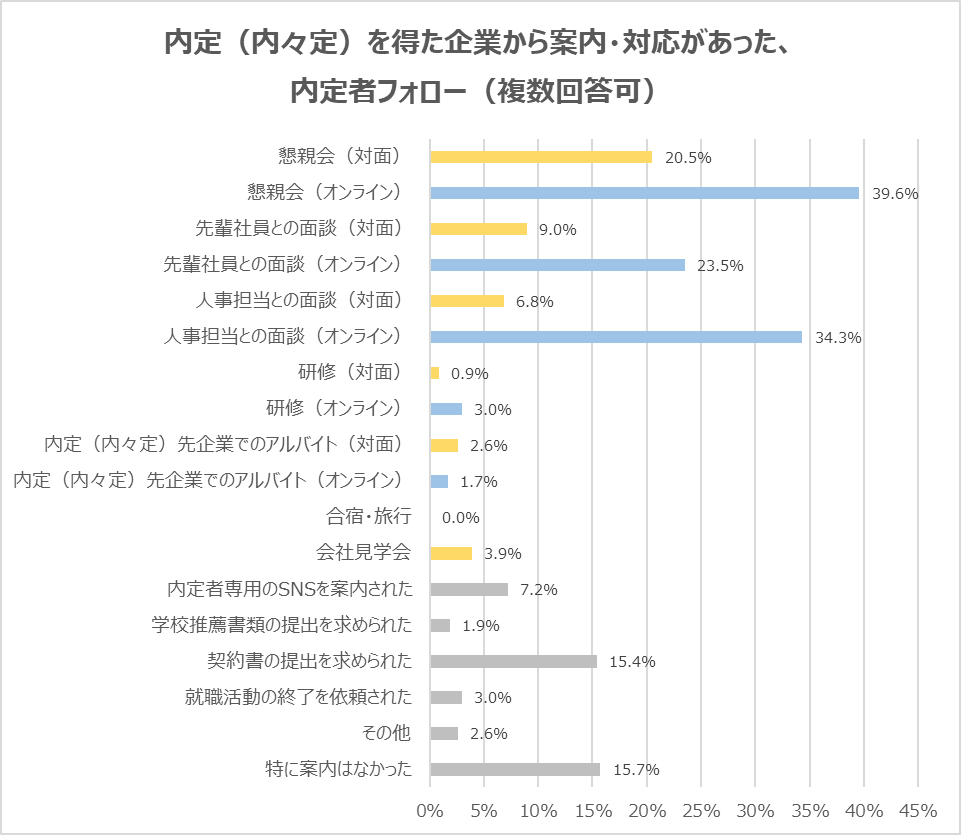 内々定を得た企業から案内・対応があった「内定者フォロー」は、「懇親会(オンライン)」が39.6%で最多。次いで、「人事担当との面談(オンライン)」34.3%、「先輩社員との面談(オンライン)」23.5%と続きました。上位3位は「オンライン」での対応が占めた一方、「懇親会(対面)」も20.5%の回答を集めています。まん延防止等重点措置の適用で、再び「リアル」な場でのフォローが縮小される可能性はあるものの、内々定者と直接コミュニケーションを深めることができる「対面」でのフォローは、根強いニーズがあることが分かります。
