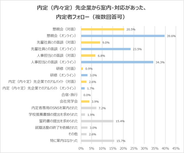 (4)内々定を得た企業から案内・対応があった「内定者フォロー」は、「懇親会(オンライン)」が最多。