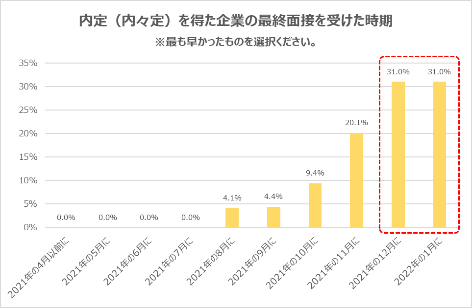 (2) 内々定を得た企業の最終面接を受けた時期は「2021年12月」と「2022年1月」が各31.0%で最多