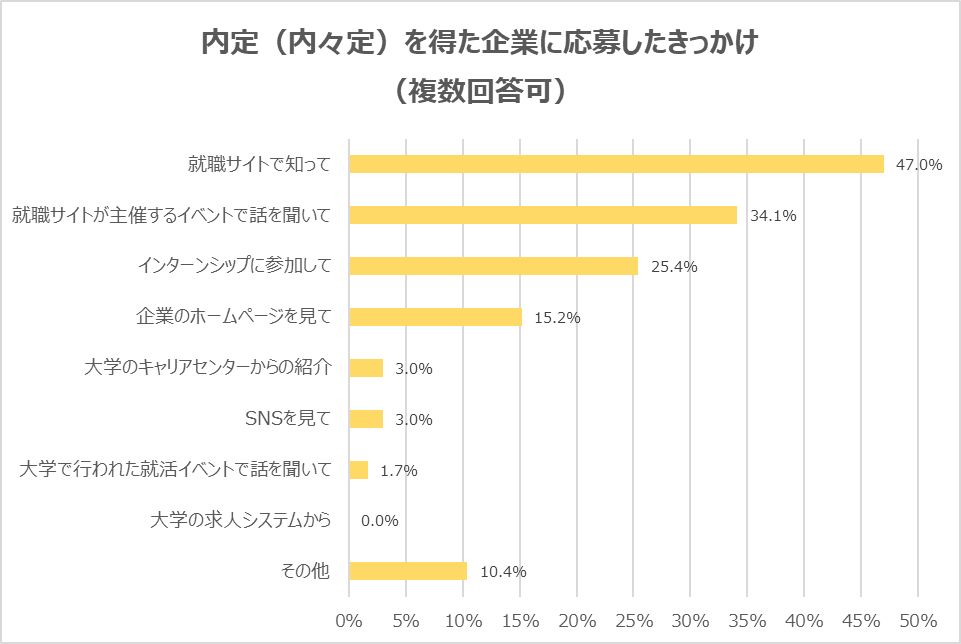 (3)内々定を得た企業に応募したきっかけは「就職サイトで知って」が47.0%で最多。