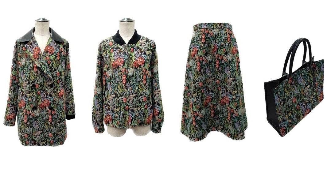 今回は、見ているだけでハッピーになり、心が安らぐゴブラン織りをつくりたいと思い、野山に咲く花々をイメージし、色とりどりのボタニカルフラワーが美しいゴブラン織りを完成させました。日本の数少ない匠の職人技と、現代の技術でつくったオリジナルのゴブラン織りを使用して、コート、ブルゾン、スカート、バッグをつくりました。