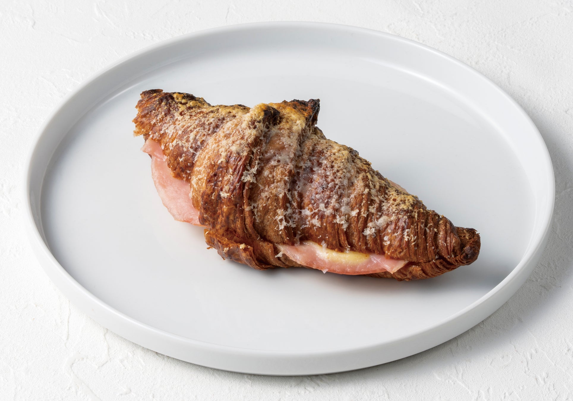 店舗で焼いたクロワッサンにホワイトソース、チーズ、ハムをはさんで焼き上げたクロックムッシュです。