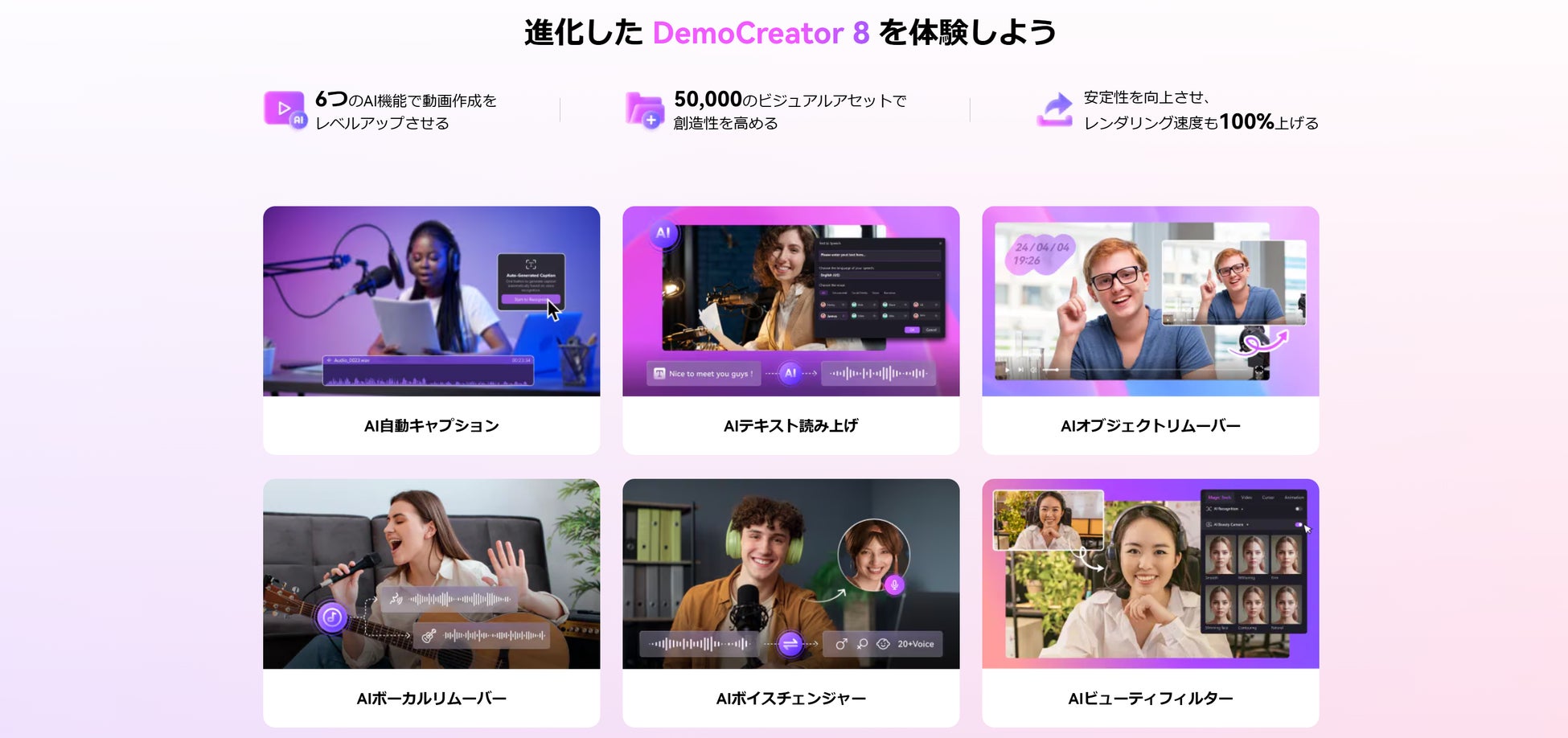 DemoCreator8では、ユーザーエクスペリエンスと高度なAIテクノロジを導入し動画制作をサポートします。