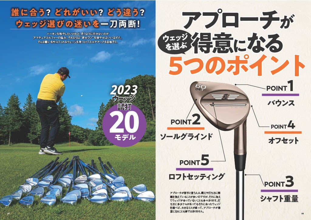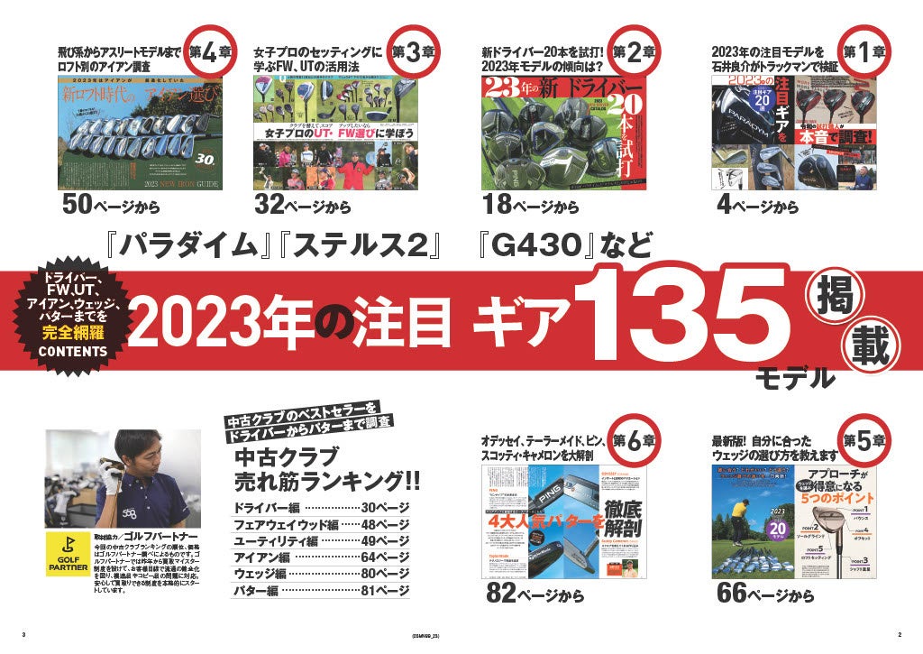 2023年話題のニューモデル、テーラーメイドの「ステルス2」キャロウェイゴルフの「パラダイム」そしてピンの「G430」など注目のドライバーを徹底比較する巻頭特集から、アイアンはプロモデルはじめ飛び系をロフト別に解説するカタログを掲載。フェアウエイウッドやユーテリティクラブも最新のアイテムを試打の感触入りカタログで紹介。さらにパターは4大メーカーに絞って、選び方を解説。最新の135モデルが詳細に解説されているギアムックです。プラスアルファとしてクラブ別の中高市場を調査し、売れ筋のベストテン形式で掲載します。