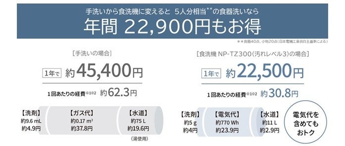 ※1 【NP-TZ300と手洗いの比較】●NP-TZ300(「汚れレベル3」でエコナビ運転OFFの場合):食器点数40点・小物20点、水温20 ℃、食器洗い機専用洗剤を5 g使用する(1箱600 g入り475円(税込))〈当社調べ〉。使用水量は約11 L。●手洗い:食器点数40点・小物20点、水温20 ℃。10 Lのお湯(約40 ℃)でつけ置き洗いした後、洗剤を9.6 mL使用(1本315 mL入り164円(税込))〈日本電機工業会調べ〉して洗い、毎分6 Lで食器1点あたり13.5秒、小物1点あたり5.5秒流し湯ですすいだとき、使用水量は約75 L。〈日本電機工業会自主基準 標準汚染時〉[2023年7月現在]【NP-TSK1、TSP1と手洗いの比較】●NP-TSK1(「汚れレベル2」でエコナビ運転OFFの場合):食器点数24点・小物16点、水温20 ℃、食器洗い機専用洗剤を5 g使用する(1箱600 g入り475円(税込))〈当社調べ〉。使用水量は約8 L。●NP-TSP1(タンク給水・「汚れレベル2」でエコナビ運転OFFの場合):食器点数24点・小物16点、水温20 ℃、食器洗い機専用洗剤を5 g使用する(1箱600 g入り475円(税込))〈当社調べ〉。使用水量は約9 L。●手洗い:食器点数24点・小物16点、水温20 ℃。10 Lのお湯(約40 ℃)でつけ置き洗いした後、洗剤を5.7 mL使用(1本315 mL入り164円(税込))〈日本電機工業会調べ〉して洗い、毎分6 Lで食器1点あたり13.5秒、小物1点あたり5.5秒流し湯ですすいだとき、使用水量は約51 L。〈日本電機工業会自主基準 標準汚染時〉[2023年7月現在]