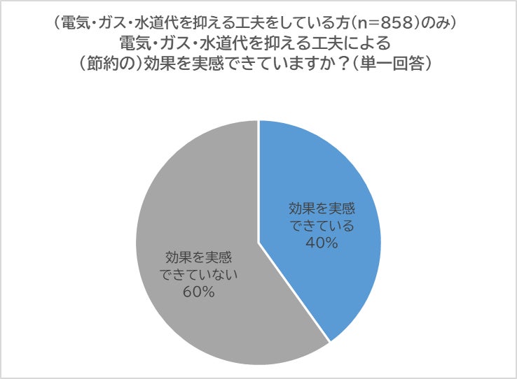 一方、「工夫をしている」と回答した方に、工夫による節約の効果を実感できているかについて尋ねたところ、「効果を実感できている」と回答した人は約4割にとどまり、約6割の方は効果を実感できていないという結果になりました。