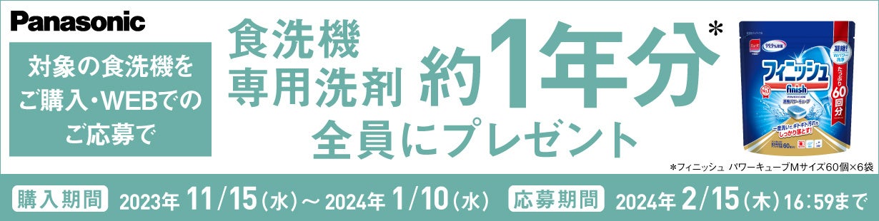 期間中に対象の食洗機をご購入いただき、WEBページにてご応募いただくと、もれなく全員に食洗機専用洗剤約1年分(フィニッシュ濃縮パワーキューブMサイズ60個入り×6袋)をプレゼントいたします。この機会にぜひご応募ください!