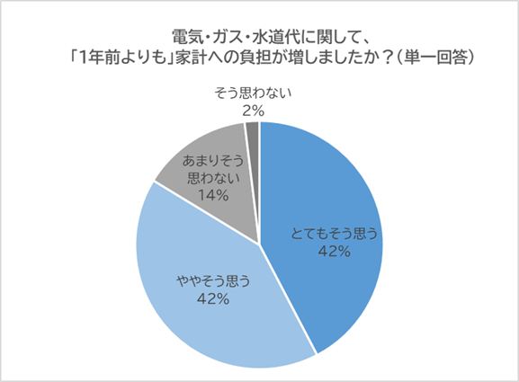 1年前よりも、電気代・ガス代・水道代の家計への負担が増したかについて尋ねたところ、