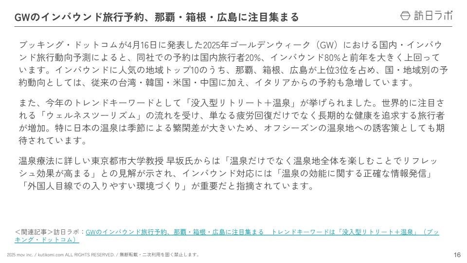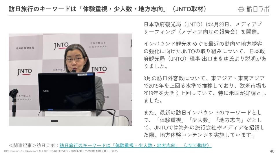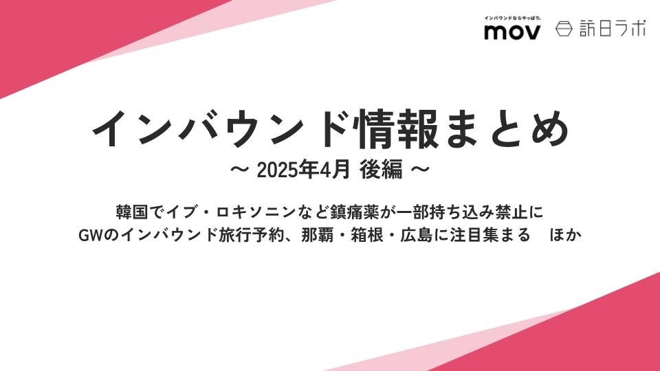 業界最大級のインバウンドビジネスメディア「訪日ラボ」及び 店舗向け集客一元化プラットフォーム「口コミコム」を運営する株式会社mov(代表取締役:渡邊 誠、本社:東京都渋谷区、以下mov)は、「インバウンドに関する最新トレンド・データ」「政府・自治体・企業などのインバウンド関連の取り組み」をはじめ、インバウンド対策に役立つニュースをまとめた「インバウンド情報まとめ【2025年4月後編】」を公開しました。