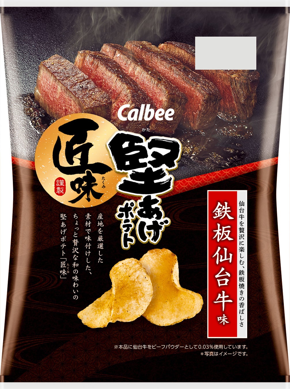 厳選素材で味付けた少し贅沢な「匠味」シリーズより新商品が登場!最高級のブランド牛「仙台牛」を使用!黒コショウで肉の旨味を引き立てた『堅あげポテト匠味(たくみ) 鉄板仙台牛味』