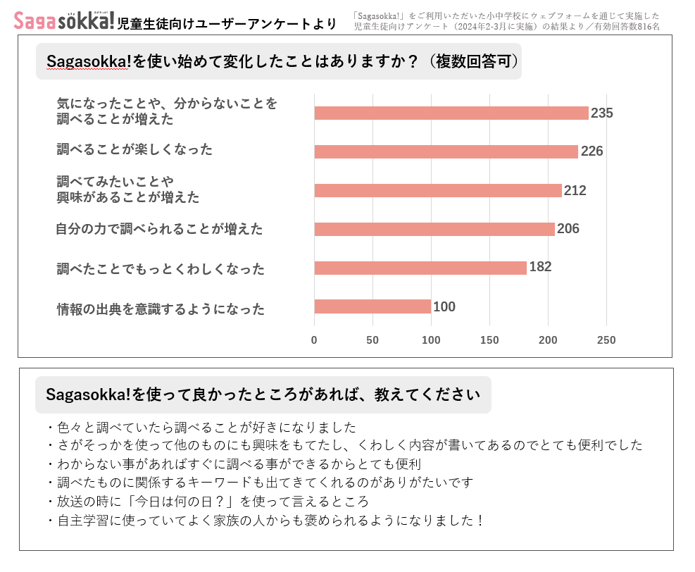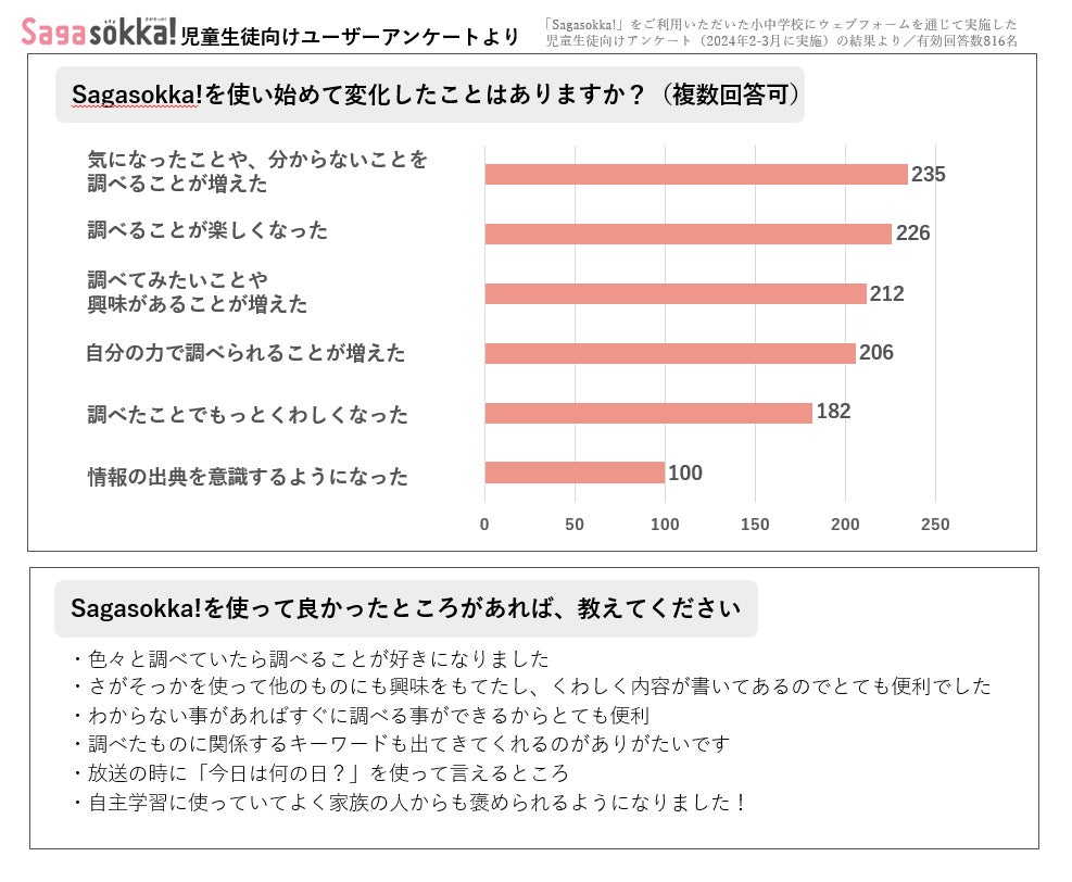児童生徒ユーザーより『Sagasokka!』で「調べることが楽しくなった」「気になったことや、わからないことを調べることが増えた」