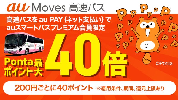 期間中、「au Moves 高速バス」で対象便のチケットをご購入いただくと、通常の30倍(200円ごとに30ポイント)をPontaポイントとして還元します。auスマートパスプレミアム会員のお客さまには、通常の40倍(200円ごとに40ポイント)をPontaポイントとして還元します。
