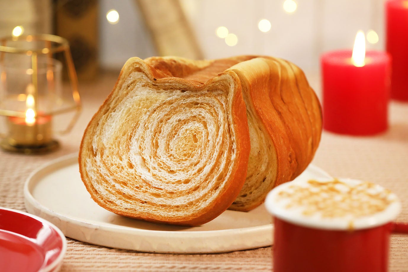 また、全国のねこねこ食パン取り扱い店舗でお買い求めいただける『ねこねこ食パン キャラメルマキアート』は、冬の定番ドリンク”キャラメルマキアート”をイメージして、キャラメル香る生地とプレーン生地をぐるぐると巻いて焼き上げました。