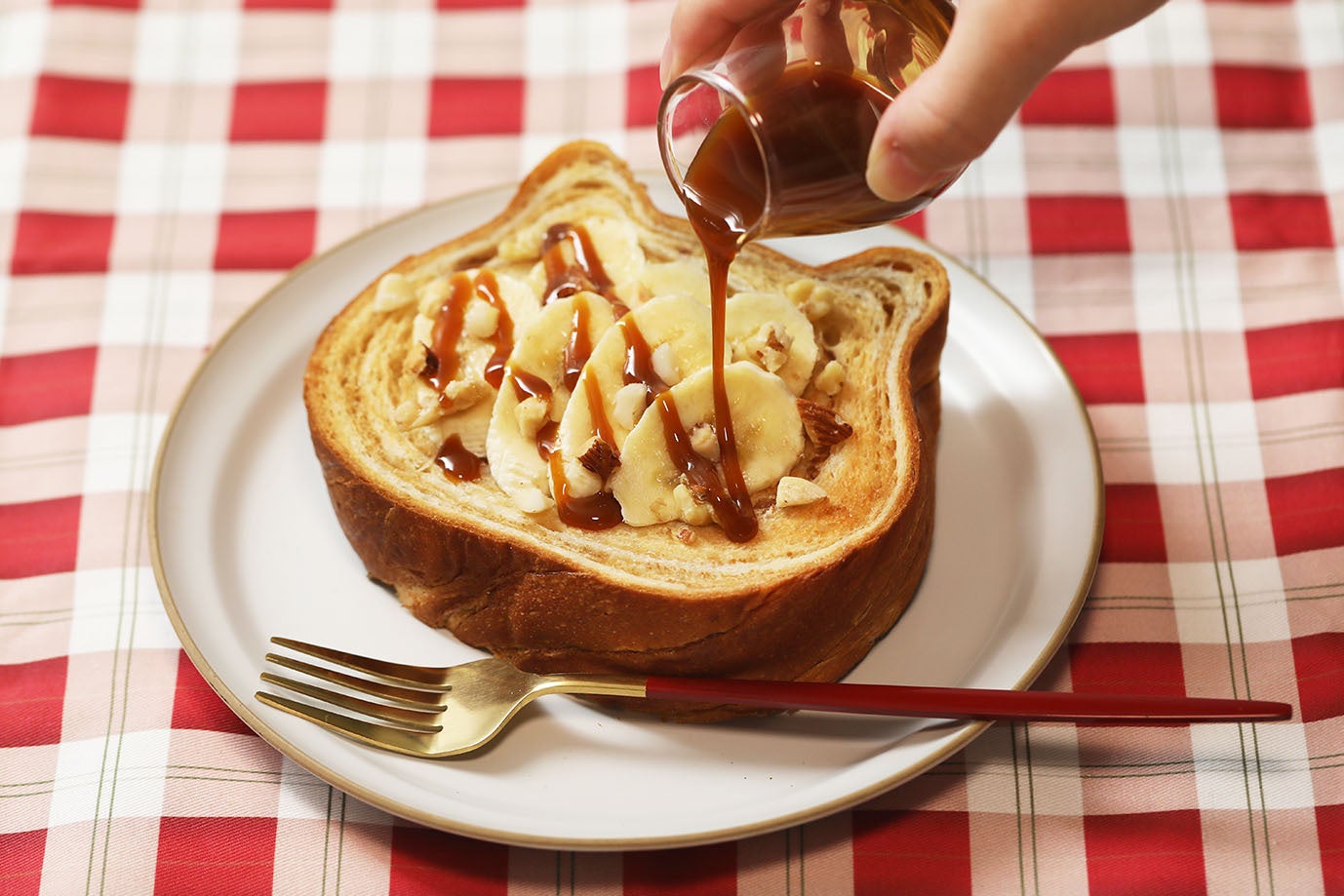 冬の定番ドリンク”キャラメルマキアート”をイメージして、キャラメル香る生地とプレーン生地をぐるぐると巻いて焼き上げました。ほんのりビターな味わいが感じられるキャラメルシートを折り込み、キャラメルマキアートの深みを表現。口の中でふんわり広がる甘い味わいが寒い冬にぴったりなねこねこ食パンです。そのままでももちろん、バナナやキャラメルソースなどをトッピングしてデコレーションいただいてもお楽しみいただけます。