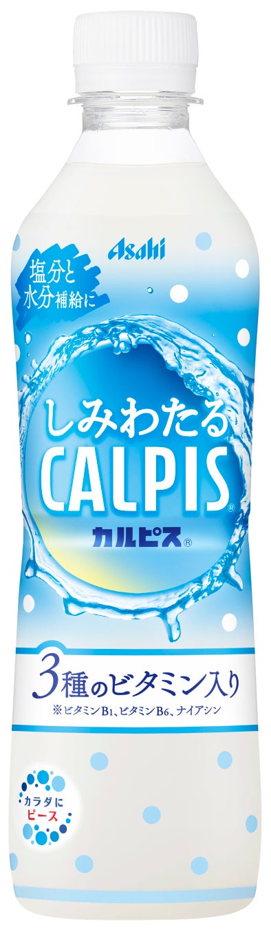 パッケージは、中央に“しみわたるCALPIS”の文字を配し、「塩分と水分補給に」「3種のビタミン入り」と記載することで商品特長を訴求しています。