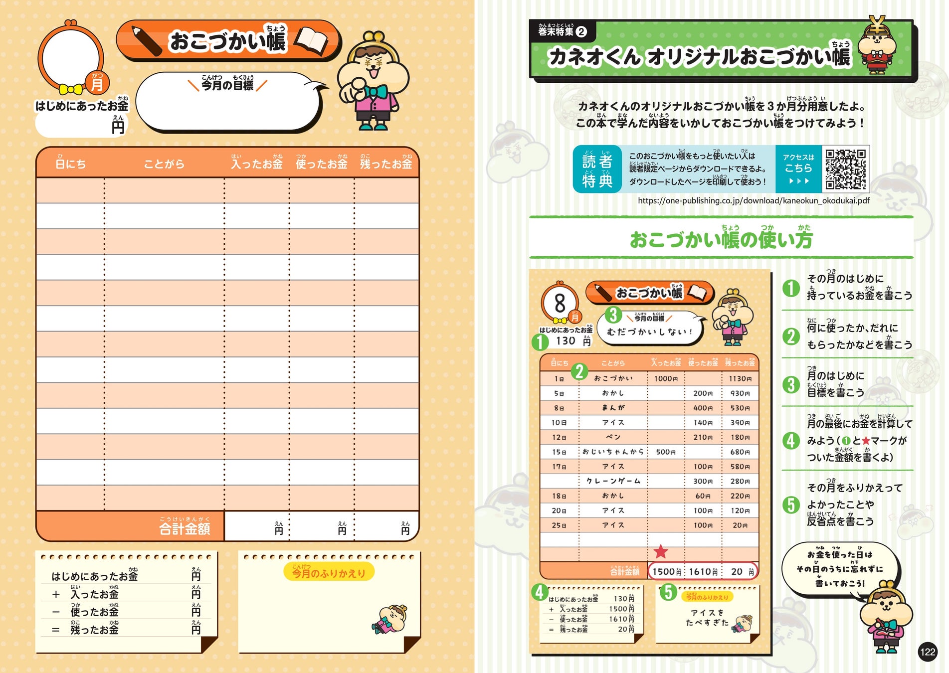 読者特典として「1. カネオくんオリジナルおこづかい帳」と「2. お金の自由研究ワークシート」が特設ページからダウンロードいただけます。カネオくんのイラストがデザインされたおこづかい帳は、初めて使う子でもわかりやすい説明付き。ワークシートは子ども向けのオンライン教育コンテンツサイトである「学研キッズネット」が監修。書き込んで学校に提出できるので、自由研究や調べ学習にすぐに活用することができます。