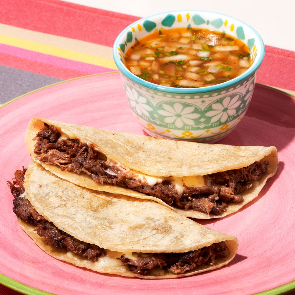 メキシコ発祥の牛肉シチュー「ビリア」のタコスとメキシカンチリを使ったスープのセットです。