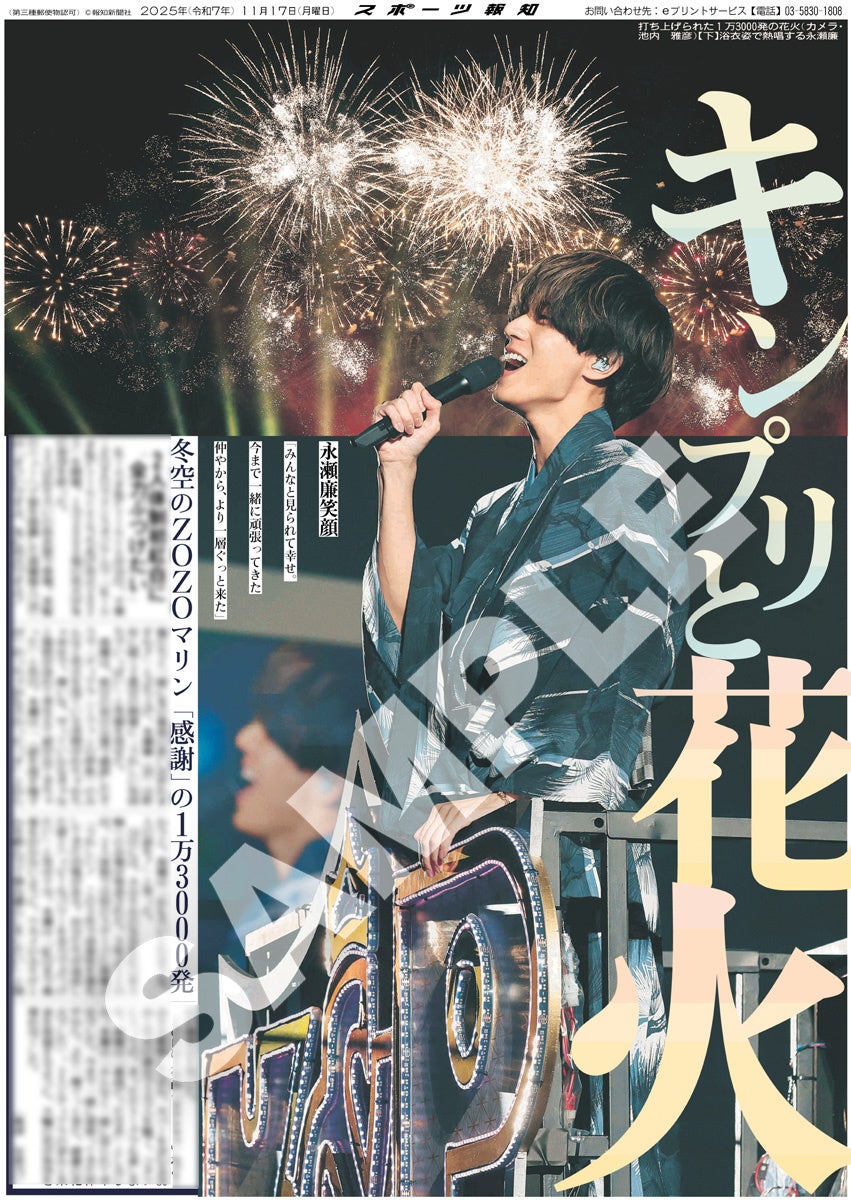 スポーツ報知を発行する報知新聞社(代表取締役社長・長谷川剛)は新聞の一部紙面をコンビニエンスストアのマルチコピー機からプリントできる「スポーツ報知コンビニプリント」サービスを展開中。スポーツ紙ならではの大きな写真を使った紙面をプリント版として販売しています。新たに11月17日付掲載、King&Princeが「King&Princeとうちあげ花火2025」を開催した模様を伝える紙面を発売中です。全4種類になります。