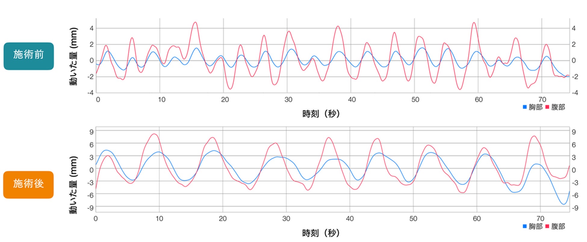 従来専門家は、触診や観察を通して胸部と腹部の動きを把握し、呼吸の状態を確かめてきました。通常、呼吸時には胸部と腹部が同期して収縮・拡張しますが、状態が乱れるとどちらかの動きが小さくなったり、同期性が損なわれたりします。しかし、このようなわずかな変化を正確に捉えることは専門家でも困難でした。