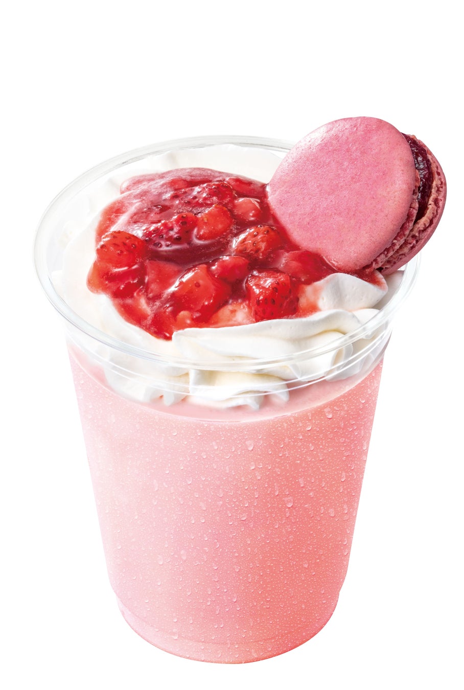 商品概要:“あまおう”の果汁入りシロップを使用したシェーキに、口どけの良いホイップクリームや苺の果肉がごろっと入ったソース、ベリーマカロンをトッピングしたスイーツです。濃厚な甘みと酸味のバランスが絶妙な“あまおう”ならではの味わいを存分にお楽しみいただける、パフェのようなシェーキです。
