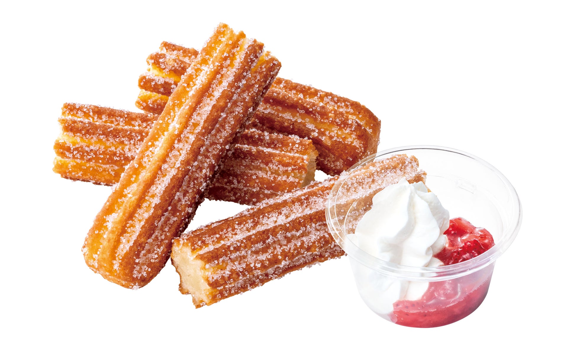 商品概要:苺の果肉がごろっと入ったソースとホイップクリームに、サクッともちもち食感のチュロをディップしてお楽しみいただくスイーツです。