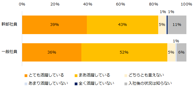 ・幹部社員は即戦力として入社しているケースがほとんどのため、活躍度合いが高いと思う。一般社員は未経験入社のケースもあり、仕事が合わないとすぐに退職することもある。