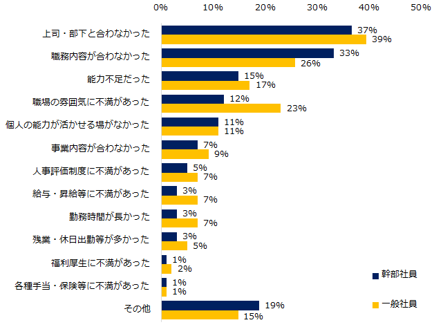 2:ミドル人材が入社後に定着・活躍しなかった要因、幹部社員・一般社員いずれも「上司・部下と合わなかった」がトップ。(図3)