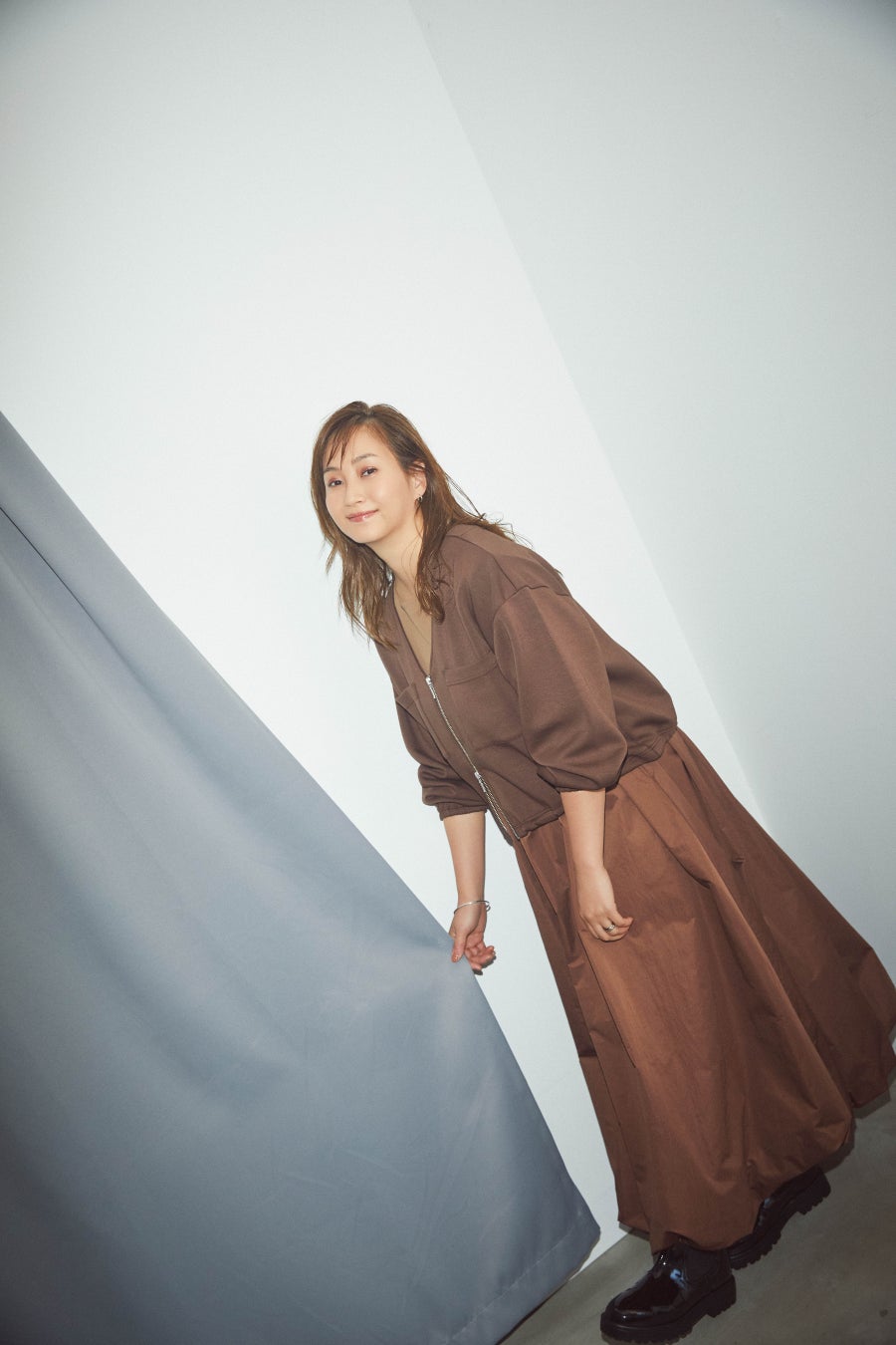●トレンドのダンボール素材を使用したジップブルゾンに、大人可愛いバルーンスカートのワンピースを組み合わせた旬の異素材アイテム