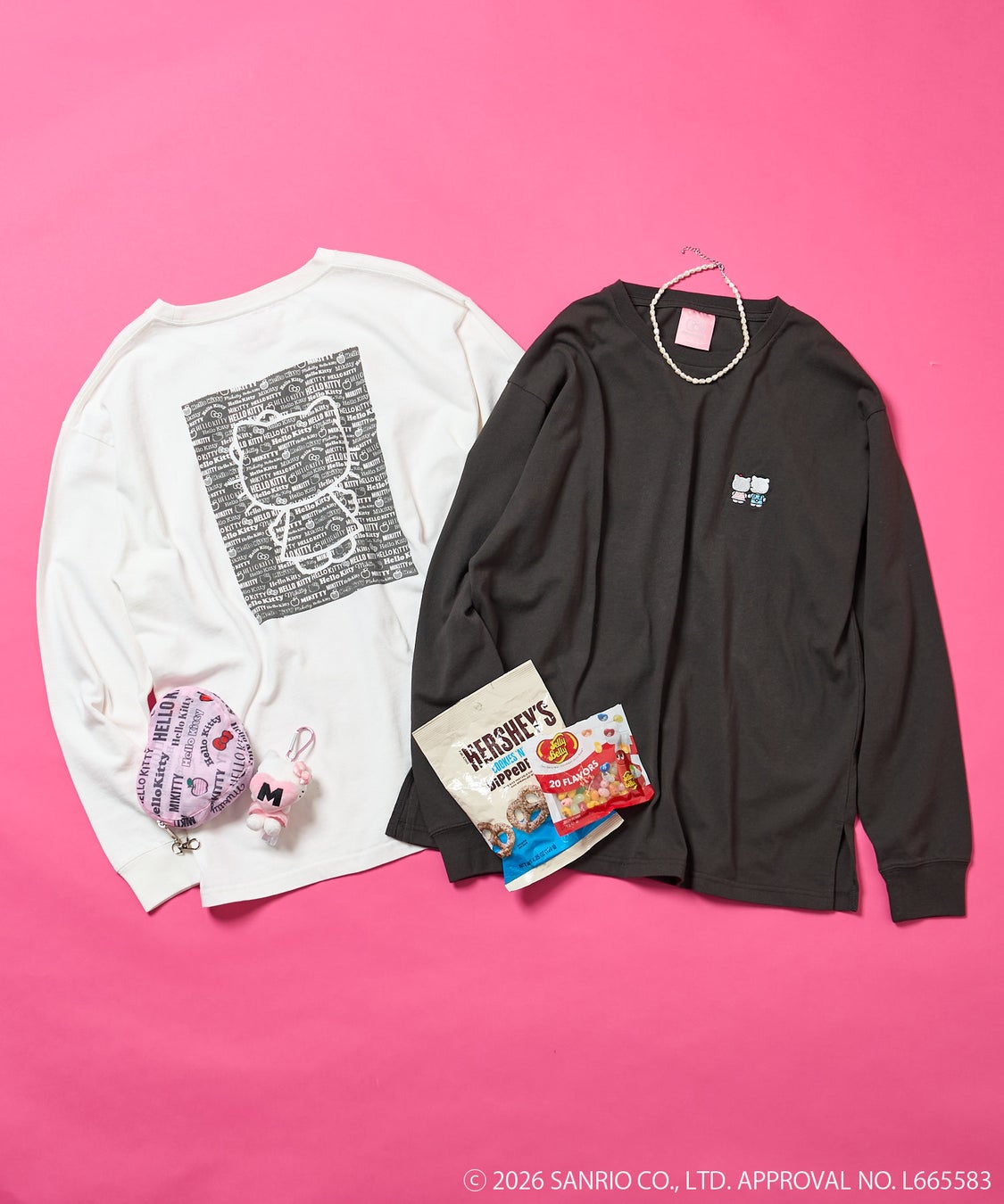 ●バックは「HELLO KITTY」のロゴを全面に散りばめた総柄プリントの上に、「ハローキティ」のシルエットを大胆に重ねたインパクトのあるグラフィック