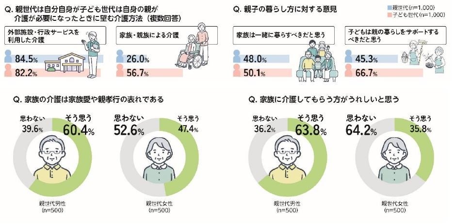 介護状態になったら、親自身は「できるだけ自立」「外部サービスを利用」と望むも、子世代は「家族で介護」と考える。