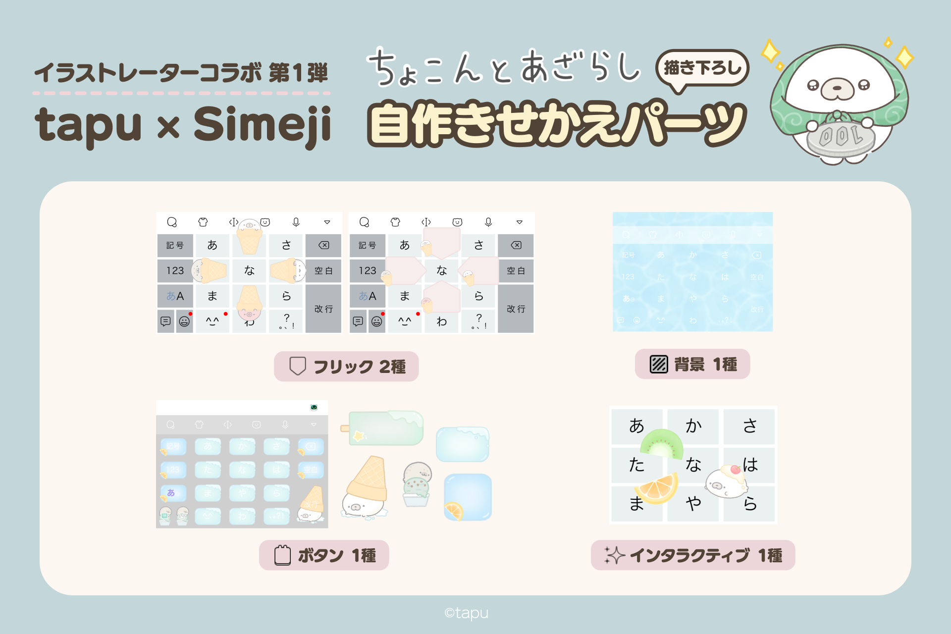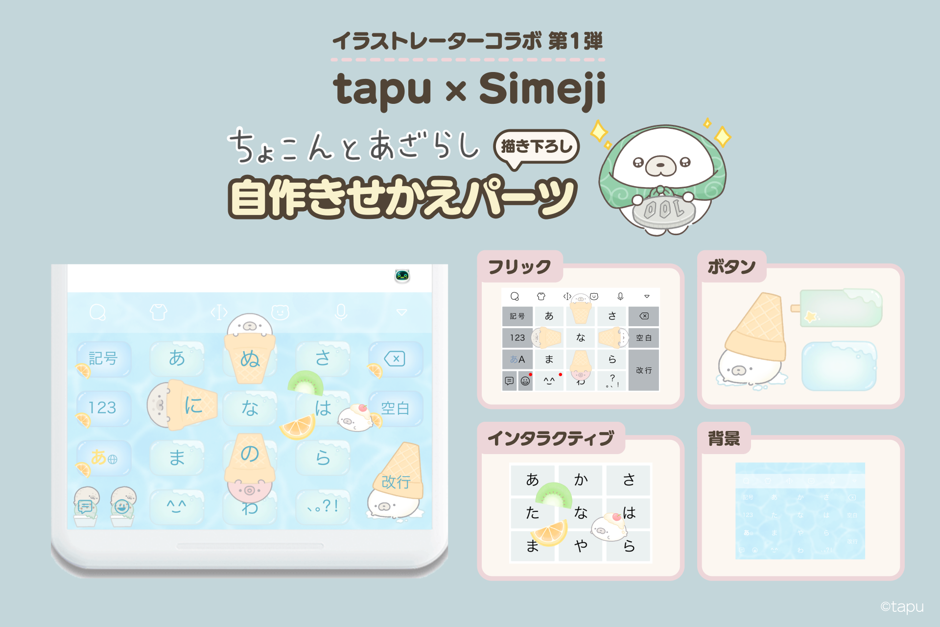 Simejiとイラストレーターのコラボイベントを開催中!第一弾は、ゆるく癒されるちょこんとあざらしのイラストがX上で人気沸騰中のイラストレーター「tapu」の自作きせかえパーツをリリースします!本コラボでゲットできる自作きせかえパーツのデザインは、Simejiだけの限定描き下ろし。だんだんと暑くなってきた季節にピッタリ!爽やかなアイスクリームのデザインは要チェックです!