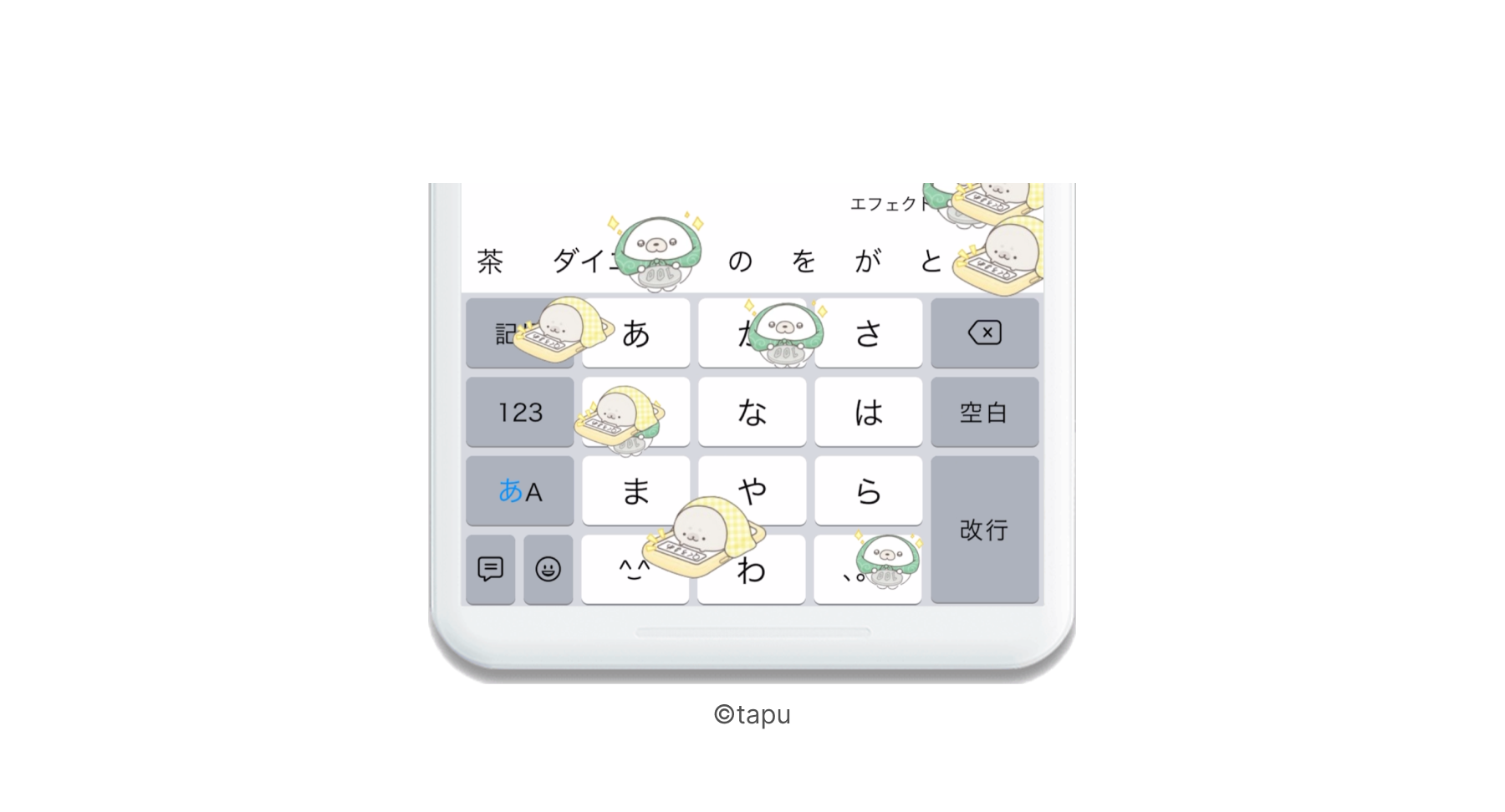 ユーザーが文字を入力し、変換候補より特定のキーワードを選択することで画像がキーボード上に現れる機能です。今回のコラボでは特定のキーワード「tapu」「ちょこんとあざらし」「あざらし」「黒豆」を入力するとエフェクトが再生されます。今回のコラボならではのエフェクトをお楽しみください。