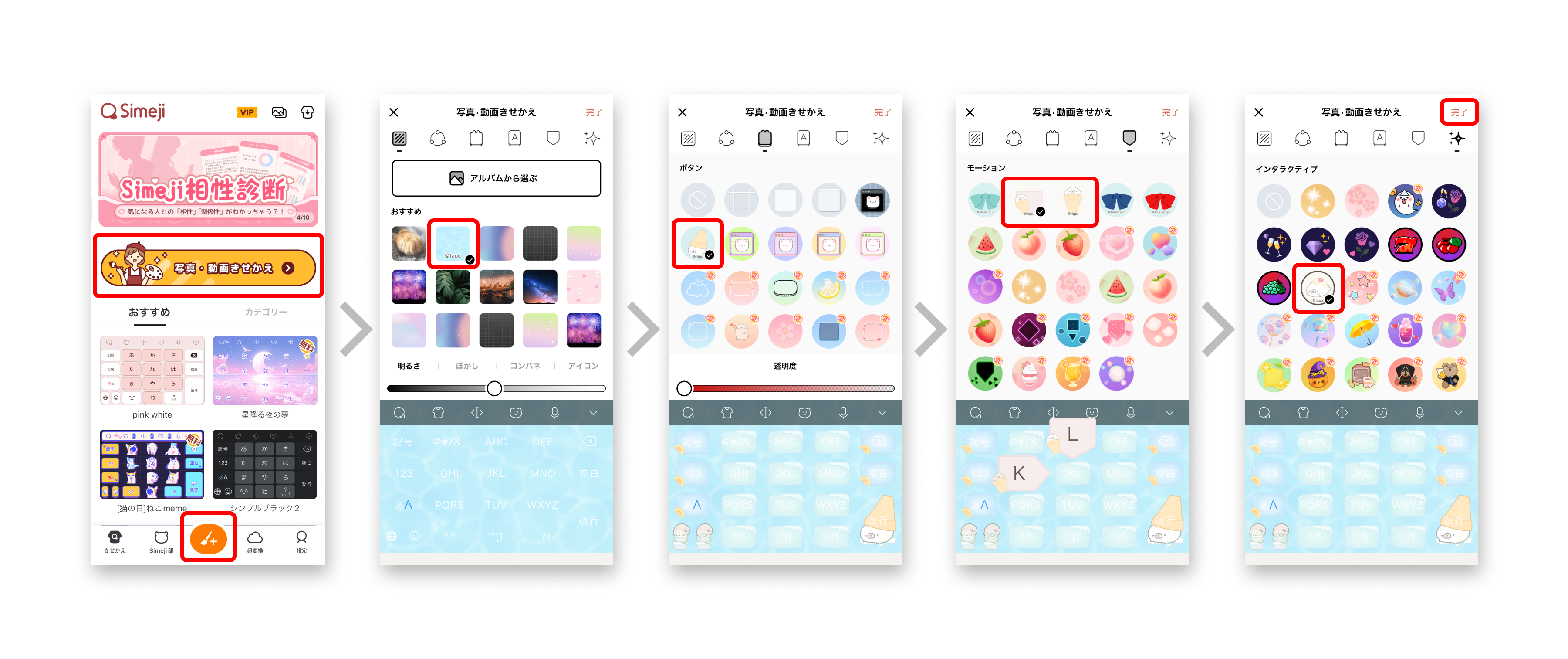 3)本コラボ限定デザインのパーツ(フリック・背景・ボタン・インタラクティブ)を選択し、右上の「完了」をタップ(完成)。