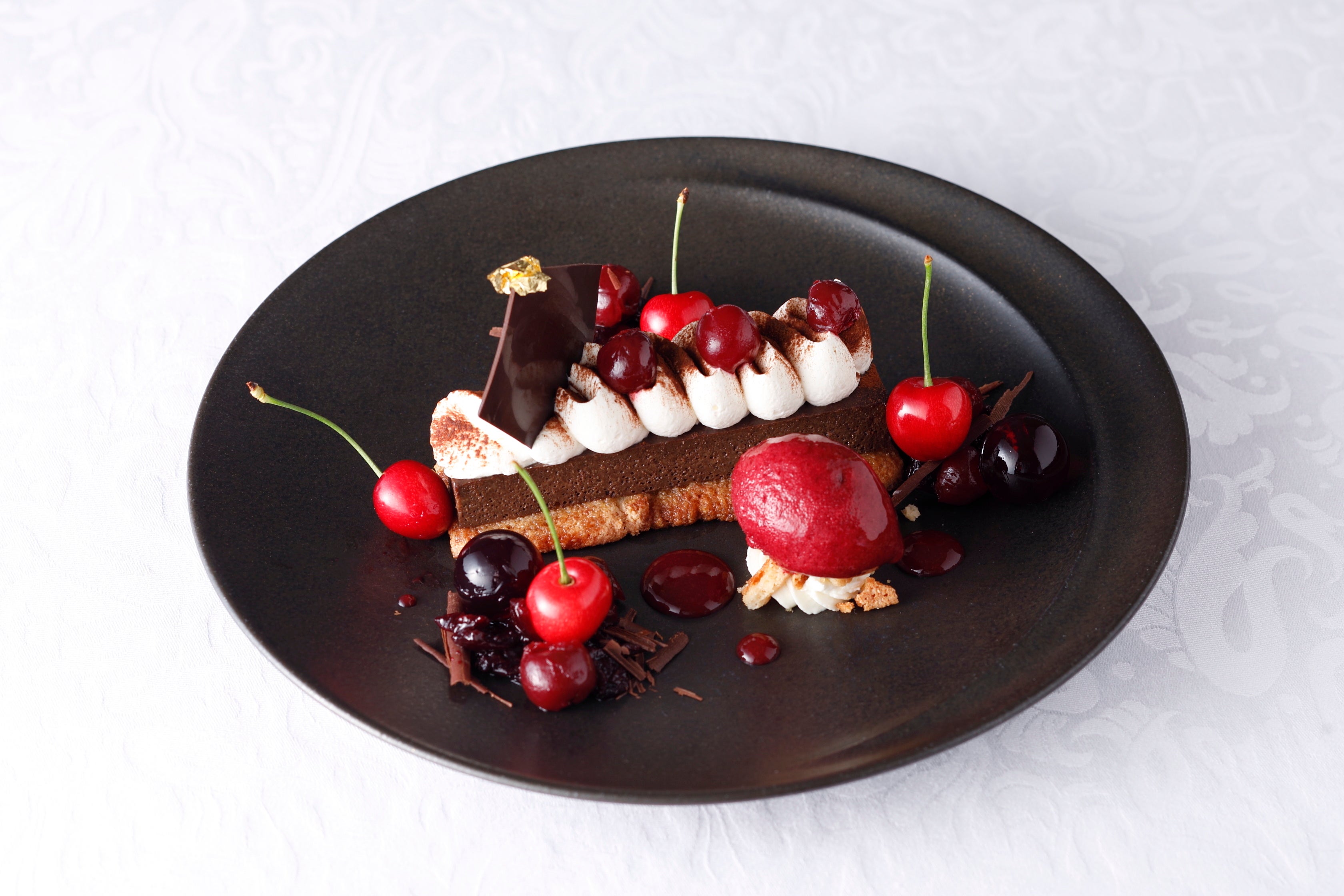 ラム酒の効いた濃厚なココア風味のボネとアマレットクリーム、酸味のあるグリオットとのマリアージュをお楽しみください。