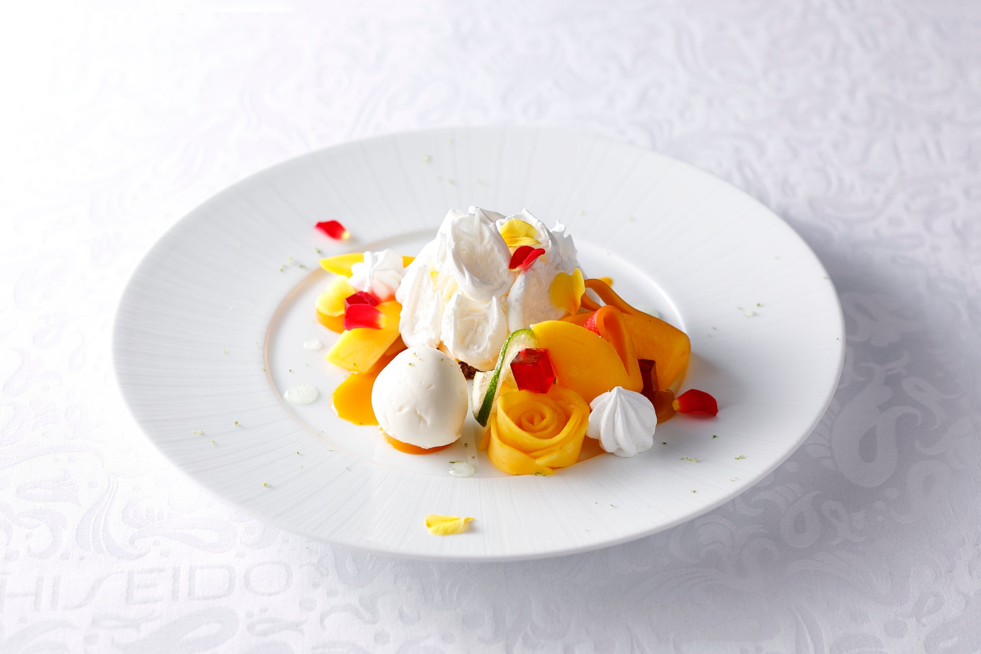 食感が楽しいヴァシュランに旬の甘くとろける宮崎県産マンゴー“太陽のタマゴ”を添えました。ココナッツソルベと一緒にトロピカルな雰囲気をお楽しみください。