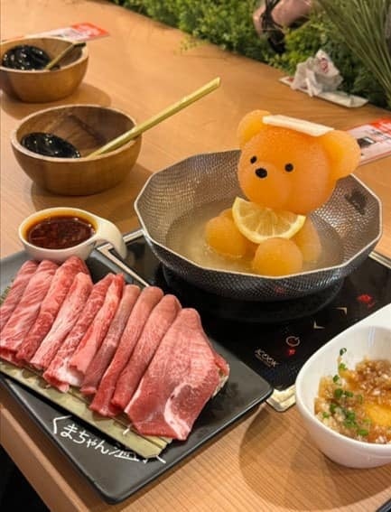 温泉に浸かっているような“くまちゃん”(食物繊維とコラーゲンで固めた出汁)を溶かしながら、北海道産の肉や彩り豊かな野菜を、しゃぶしゃぶで召し上がっていただけます。
