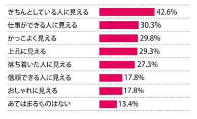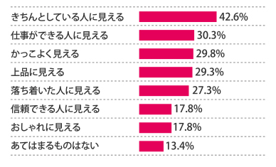 「ジャケットを着ている人を見るとどう思いますか」という質問に対し、「きちんとしている人に見える」と回答した人は42.6%。「仕事ができる人に見える」は30.3%と、よりよい印象を与える効果が見込める。