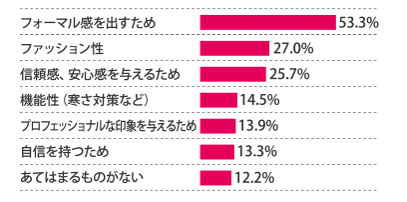 「ジャケットを着用する理由」に対し、「フォーマル感出す」と回答した人は53.3%、「信頼感、安心感を与える」は25.7%と、相手を意識するときや、「きちんと感」を求められる際にジャケットを選ぶ人が多かった。