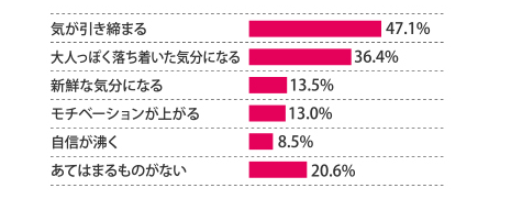 「ジャケットを着用するときの気分」についての質問に対し、「気が引き締まる」と回答した人は47.1%。その他、「大人っぽく落ち着いた気分になる」と回答した人は36.4%と、プラスの影響があることが示唆された。