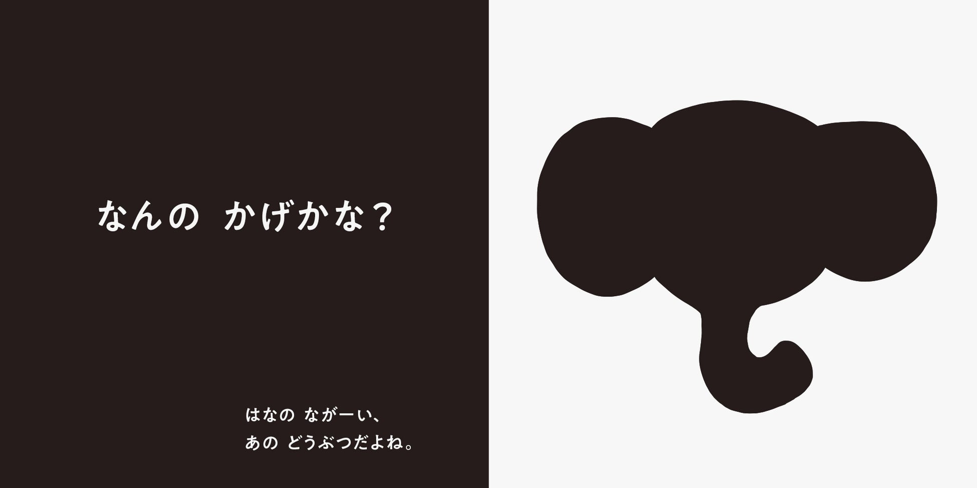 「なんの かげかな? はなの ながーい、あの どうぶつだよね。」ぞうの顔の「かげ」かと思いきや……きっとあなたはその答えを見て、驚くと同時に笑ってしまうはず! 想像していた答えと全く違うシルエットクイズに、子どもも大人も思わずツッコミたくなること間違いなしです。子供の想像力を豊かにし、発想することの面白さを教えてくれる絵本。3歳から。