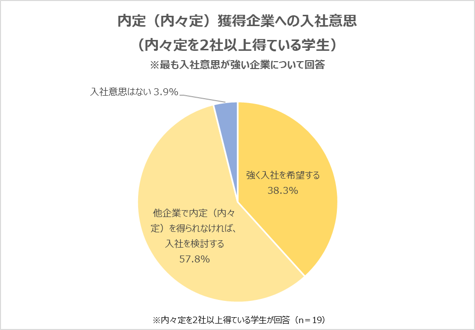 内々定を複数得ている学生の約4割が、内々定先の企業に「強く入社を希望する」と回答。前年同時期比25.7ポイント増/2023年卒対象アンケート