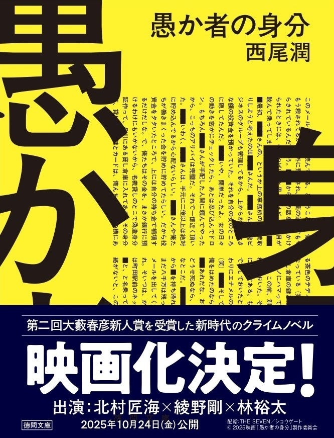 この度、徳間書店が発行する第二回大藪春彦新人賞受賞作、西尾潤氏の戸籍ビジネスの闇を描いた新時代のクライムノベル『愚か者の身分』(徳間文庫)が、北村匠海さん×林裕太さん×綾野剛さん出演で映画化、2025年10月24日(金)に全国公開されることが決定いたしました。
