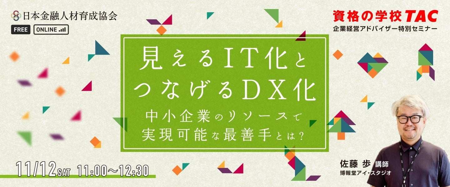 公認会計士や税理士など、多くの国家資格や検定試験の受験指導などの教育事業を展開しているTAC株式会社(東京都千代田区、代表取締役:多田敏男)は、経営知識が学べる企業経営アドバイザー講座から、無料セミナー「見えるIT化とつなげるDX化 中小企業のリソースで実現可能な最善手とは?」を2022年11月12日(土)に開催します。