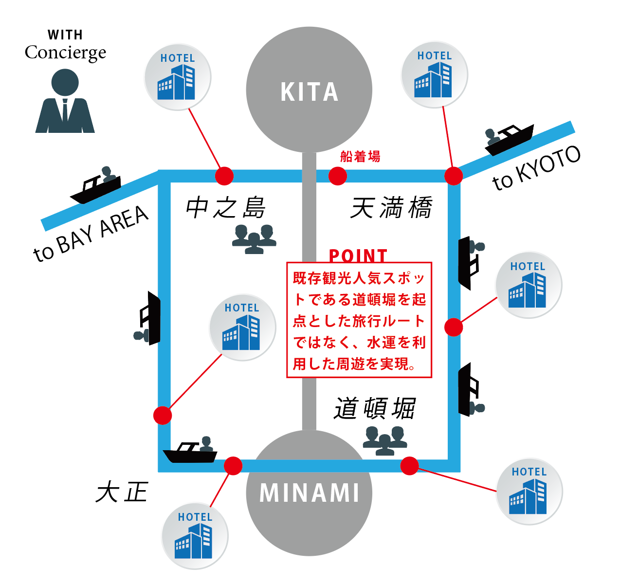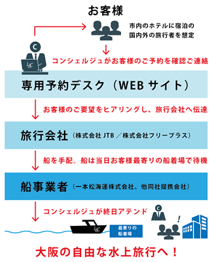 なお、本サービス開始にあたり、実証事業を2022年2月中旬に実施します。実証事業ではあらかじめモデルコースを設定し、事業関係者に水上を起点とした大阪観光を体験いただき、4月以降の本サービス提供に向けた検証を行います。
