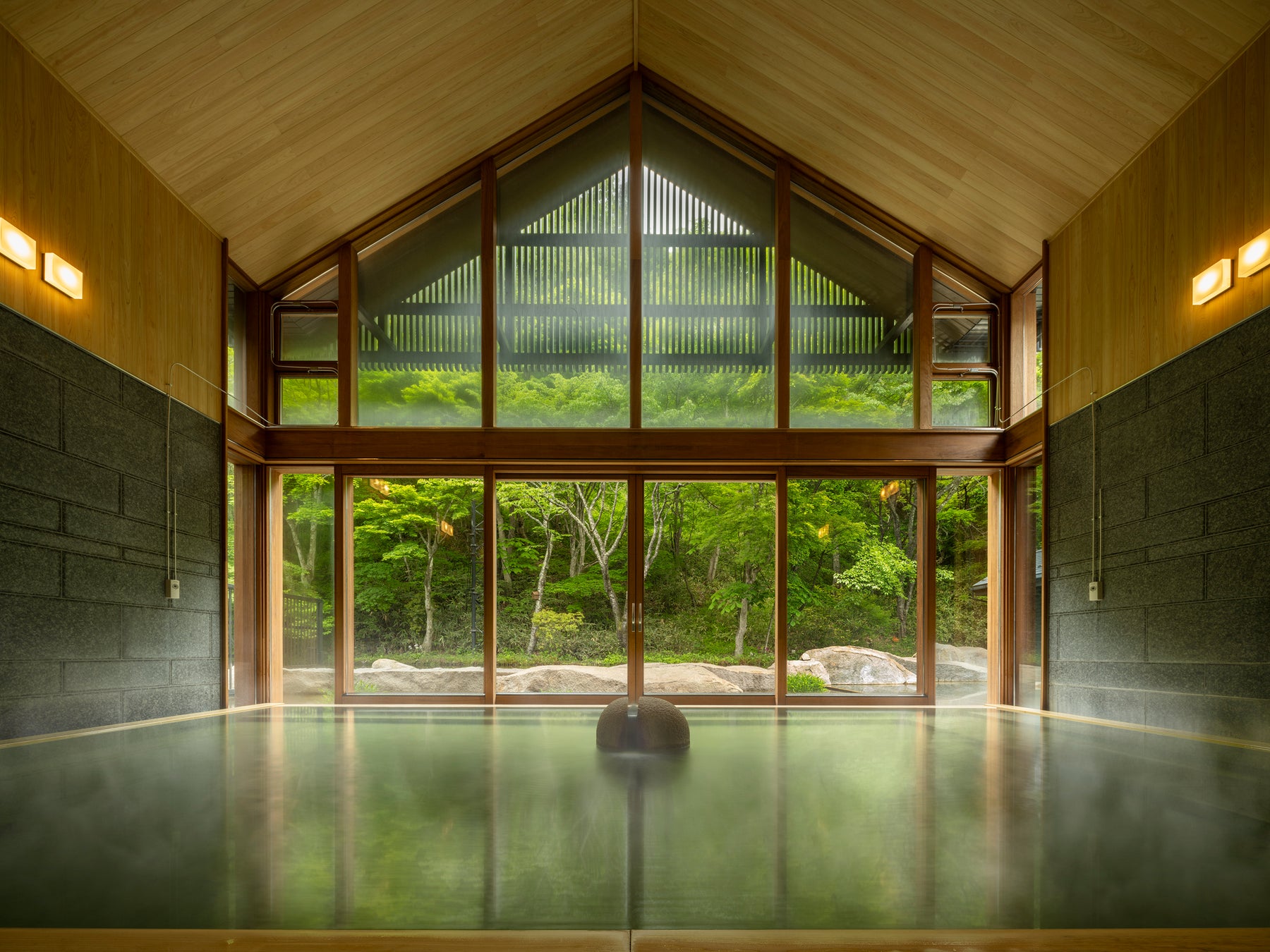「温泉クラシックス」の舞台は、普段は源泉かけ流しの温泉施設として営業している「星野温泉 トンボの湯」(以下、トンボの湯)。トンボの湯の特徴である約7.6mの高い天井と85cmの深い浴槽がある内湯の空間と広々とした露天風呂を客席に見立て、森を背景に行う生演奏を企画しました。高い天井のある内湯では豊かな音の響きを、露天風呂では自然に囲まれた開放的な空間で演奏を楽しめます。湯船の中には、客席としてひのきの椅子が置かれ、10cm程の湯が張られます。ゆったりと足湯に浸かりながら演奏に耳を傾ければ、”音楽と温泉でととのう”新体験に。