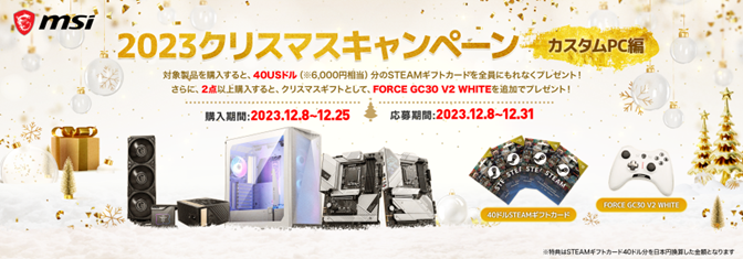 この度、エムエスアイコンピュータージャパン株式会社は、12月8日(金)より、「2023クリスマスキャンペーン カスタムPC編」を開催いたします。対象製品を購入するともれなく 40USドル(6,000円相当※)分のSTEAMギフトカードをプレゼント!さらに2点以上購入すると、クリスマスギフトFORCE GC30 V2 WHITE を追加でプレゼントいたします。