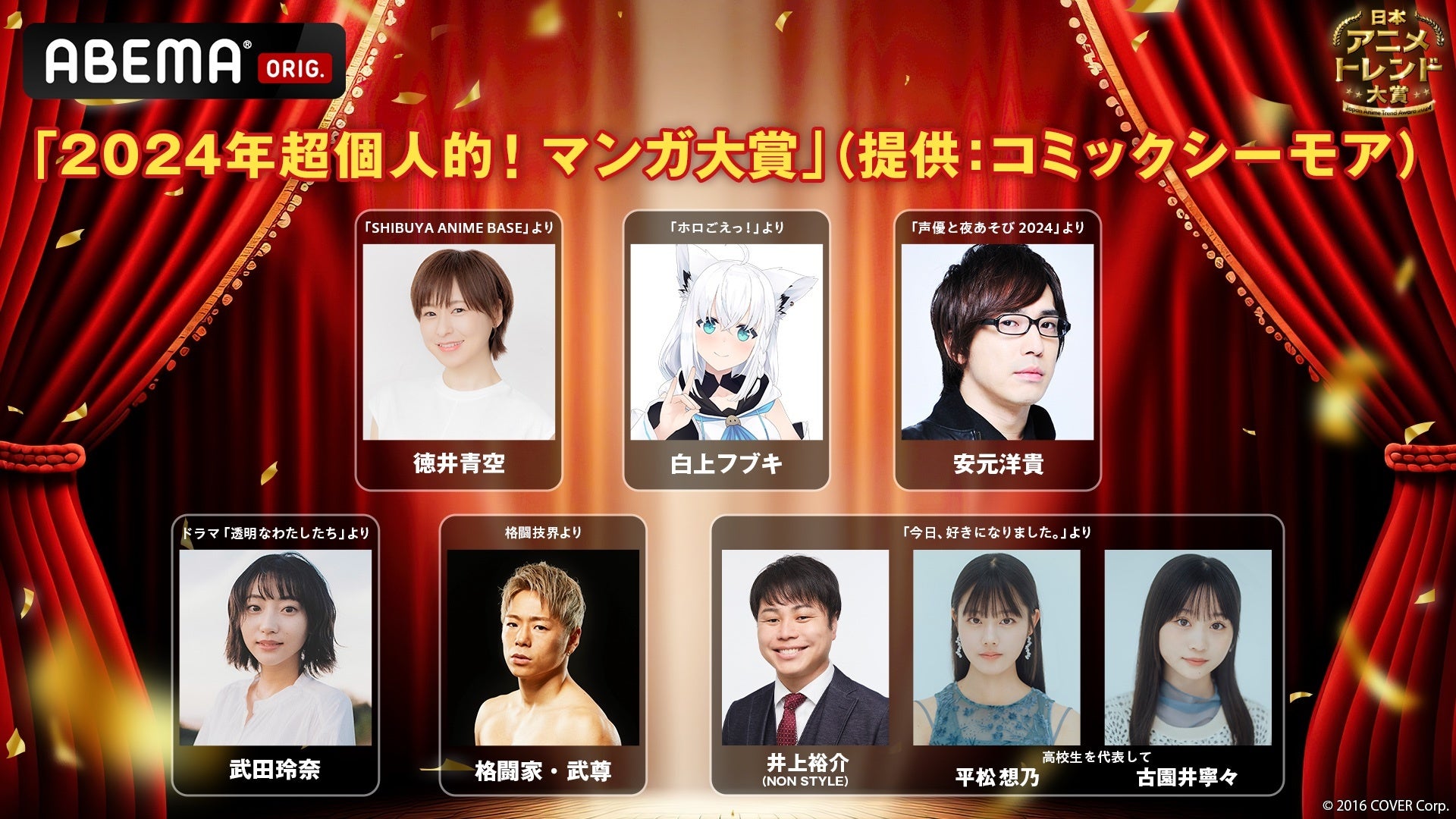 さらに「ABEMA」の人気番組とゆかりのあるメンバーが、2024年の漫画トレンドを振り返る「2024超個人的!マンガ大賞」では、『声優と夜あそび 2024』より安元洋貴さん、『SHIBUYA ANIME BASE』より徳井青空さん、『ホロごえっ!』よりVTuber・白上フブキさん、オリジナル連続ドラマ『透明なわたしたち』より武田玲奈さん、『今日好きになりましたシリーズ』よりNON STYLE・井上裕介さんと高校生代表の平松想乃さん、古園井寧々さん、格闘技界を代表して格闘家・武尊さんといったジャンルの垣根を超えた幅広いメンバーからの特別コメントもお届けいたします。コミックシーモア提供のもと、「個人的!マンガ大賞」と称して王道の名作から知る人ぞ知る作品まで、余すことなくマンガ愛を語っていただきます。ぜひご注目ください。