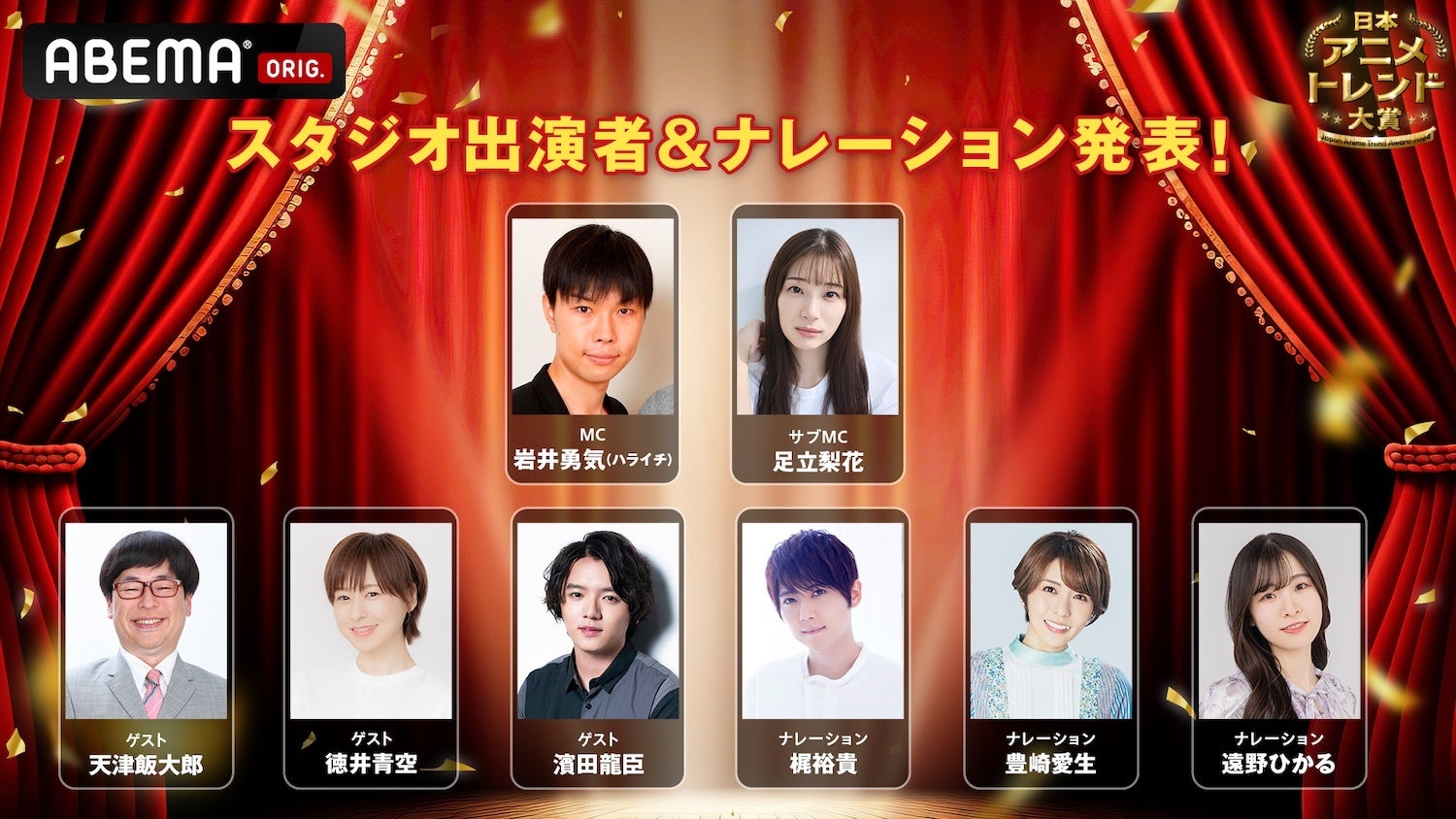 このたび、サブMCに足立梨花さんの就任が決定。さらにナレーションは、梶裕貴さん、豊崎愛生さん、遠野ひかるさんが務めることが決定いたしました。足立さんは初出演でのサブMC就任について「アニメ大好きな私としてはとても光栄」とコメント。さらに梶さんは「この番組を観れば、今年のアニメ事情が丸わかり!」、豊崎さんは「放送当日はぜひコメントでもご参加くださいね」、遠野さんは「“トレンド“に乗って、一緒に楽しみましょう!」と呼び掛けています。その他、天津飯大郎さん、徳井青空さん、濱田龍臣さんといった芸能界屈指のアニメ好きメンバーもゲストとして登場いたします。