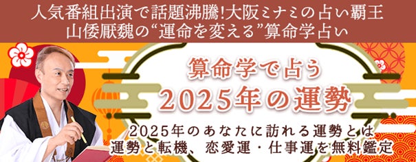 大阪ミナミの占い覇王として数々の番組やメディアで人気を博している山倭厭魏(やまとおうぎ)による本格算命学サイト『山倭厭魏の算命学』にて、この度算命学で占う『2025年の運勢占い』を無料公開いたしました。生年月日を入力するだけで、2025年にあなたに訪れる運勢や今後の転機、未来の重要な出来事、仕事運、恋愛運などを占うことができます。